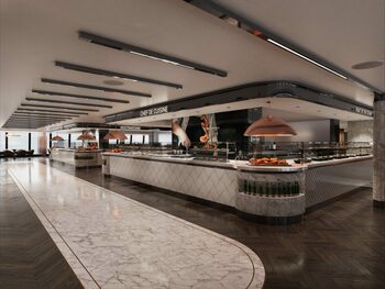 Dishes include sushi, fresh seafood and a daily rotisserie offering grilled, roasted, and slow-cooked meats. Pasta is cooked to order, and freshly baked pizzas and bread are on offer as are home-made sandwiches. Charcuterie, fromagerie, boulangerie and patisserie stations add even more choice.