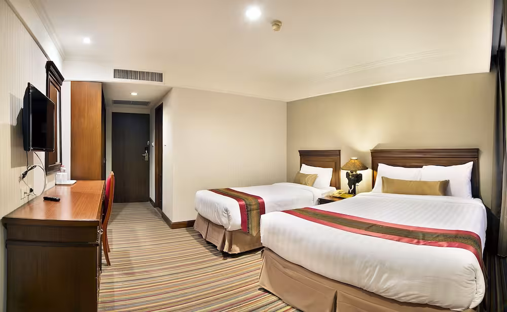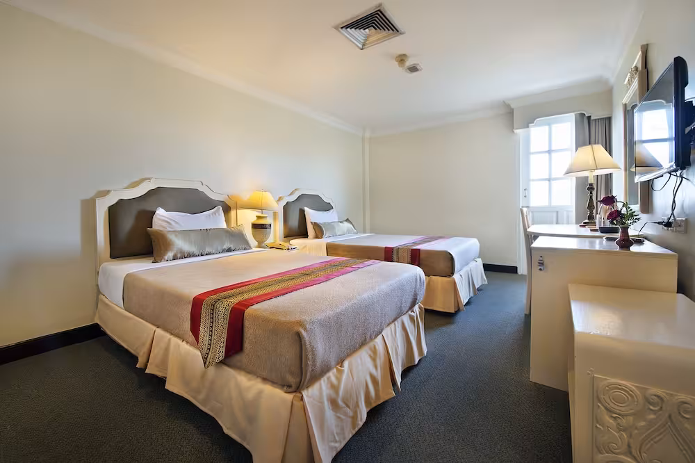 The hotel is situated on Rajadamnern Road, in the heart of the old town of Bangkok, where many tourist attractions are concentrated, such as the Grand Palace, the National Museum and several of the best known Buddhist temples, which are all within easy walking distance. It is 40 km from Don Mueang International Airport and 45 km from Suvarnabhumi Airport.