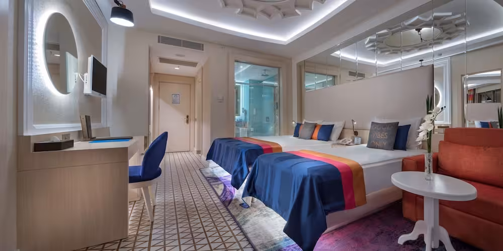 Perfect for business travellers as well as families, this spa hotel is situated on a quiet street a short walk from the tourist heart of Belek entfernt. The region is particularly popular with winter sports enthusiasts. A network of cross-country trails begins about 90 km away. Guests can reach the nearest shops, bars and restaurants in about 2 km and bus connections in around 1 km.