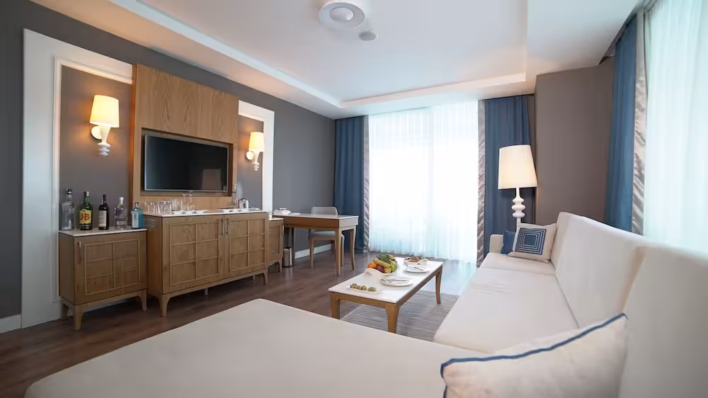 Air conditioning and central heating ensure that rooms maintain comfortable temperatures. Guests can enjoy the sea view from a balcony or terrace. The rooms have a double bed and a sofa bed. Separate bedrooms are available. Children's beds and extra beds can be requested for younger guests. A safe, a minibar and a desk are also available. Guests will also find a tea/coffee station included among the standard features. A direct dial telephone, a television with satellite/cable channels and WiFi (no extra charge) provide all the essentials for a comfortable holiday. Slippers are included. Bathrooms are equipped with a shower, a bathtub and a whirlpool bath. A hairdryer and bathrobes are available for daily use. As an extra convenience, bathrooms provide cosmetic products. Guests can also book wheelchair-friendly rooms with wheelchair-accessible bathrooms. The hotel has family rooms and non-smoking rooms.
