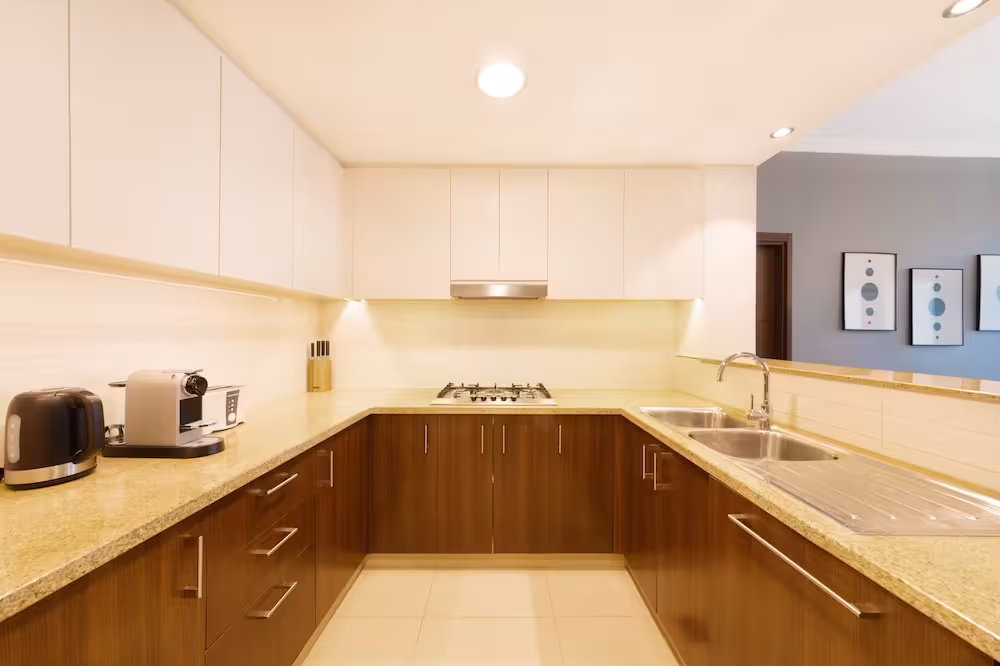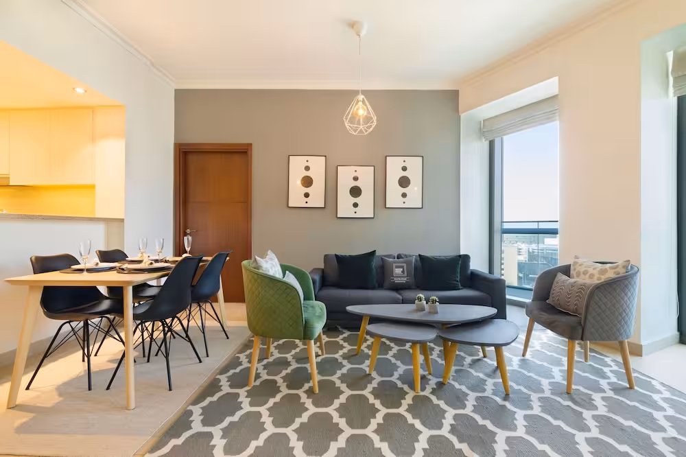 This apartment complex warmly welcomes guests in Dubai.