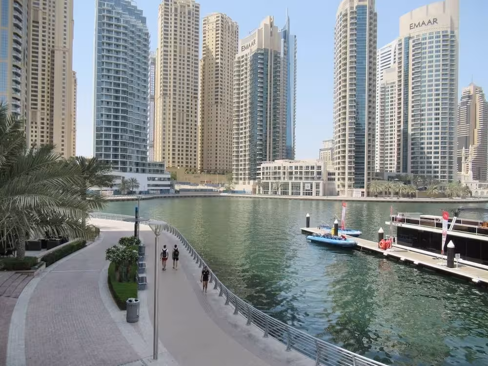 This apartment complex welcomes guests in Dubai.