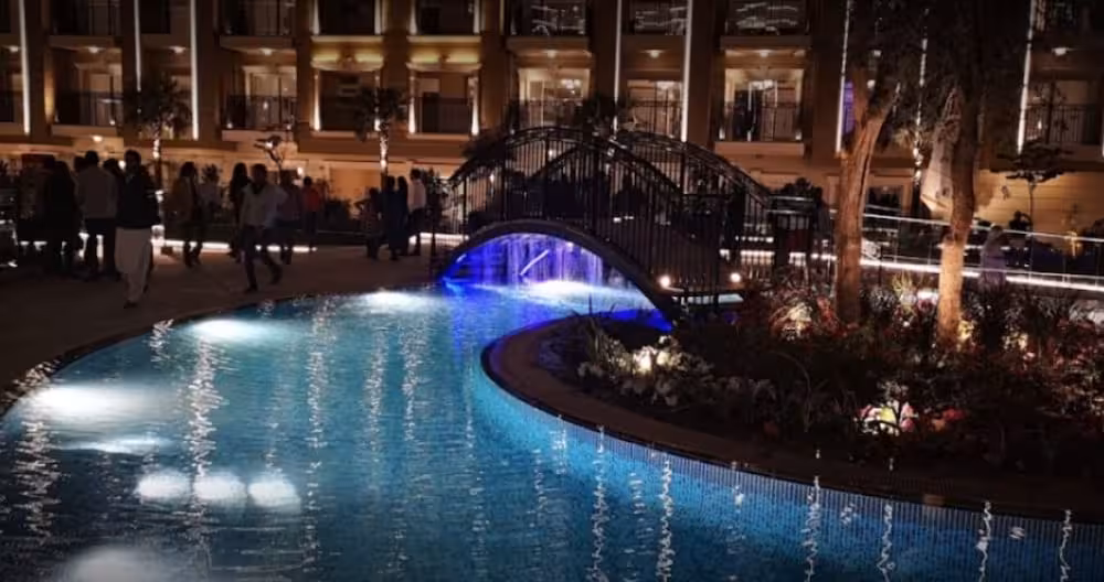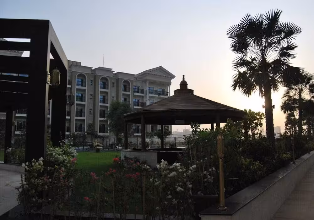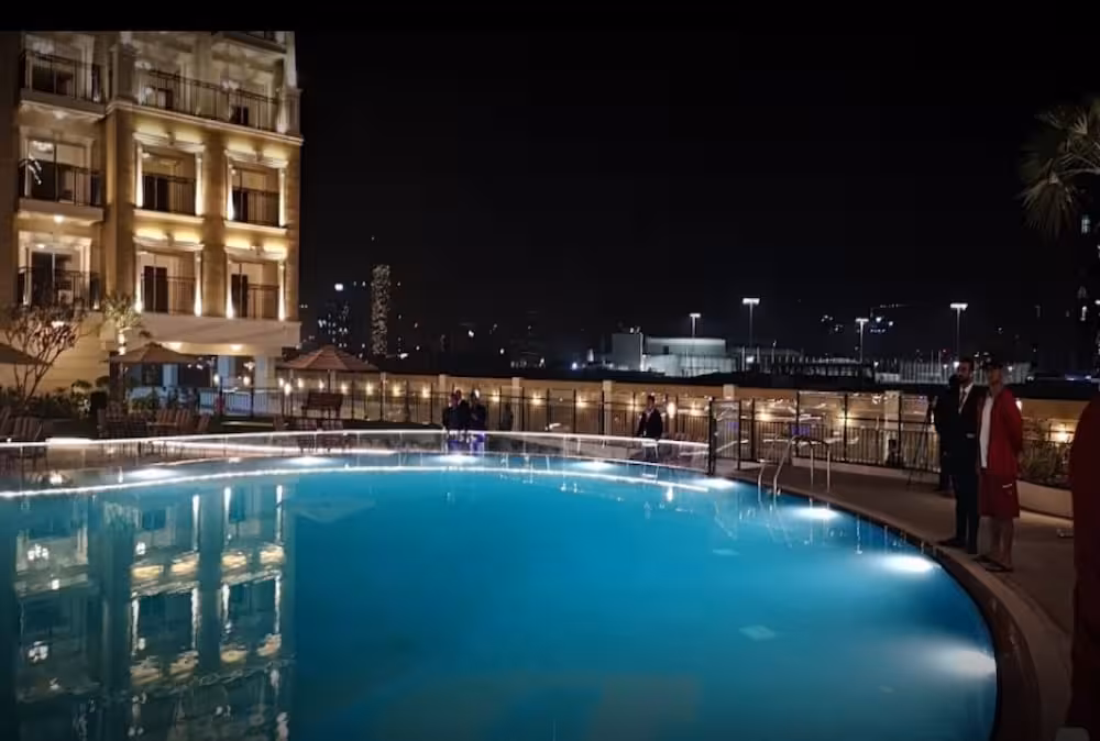 This apartment complex warmly welcomes guests in Dubai.