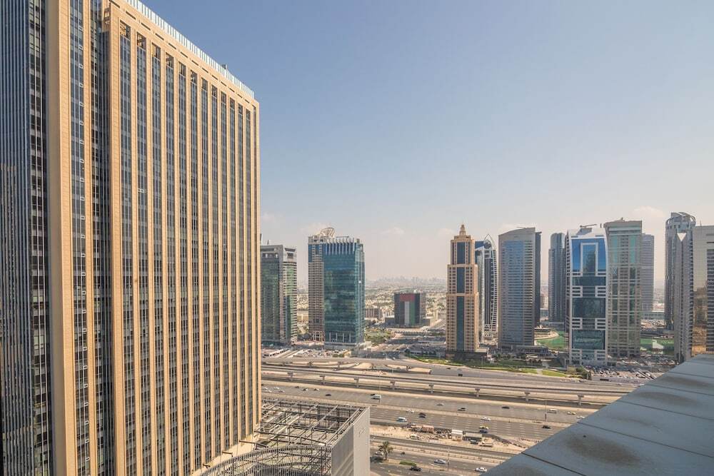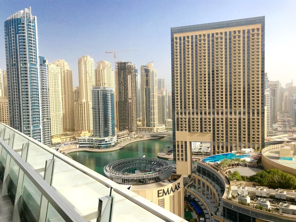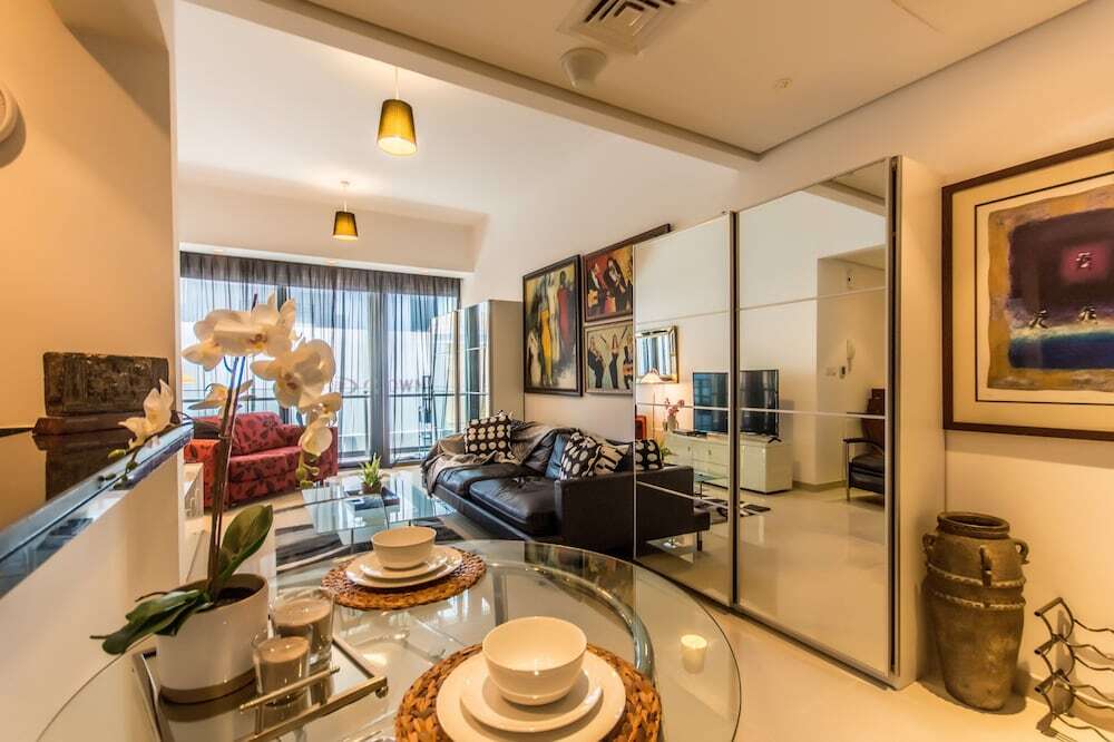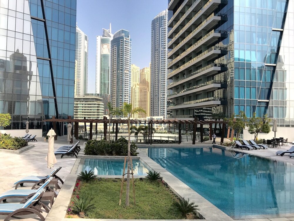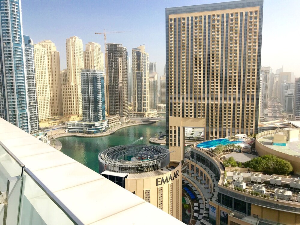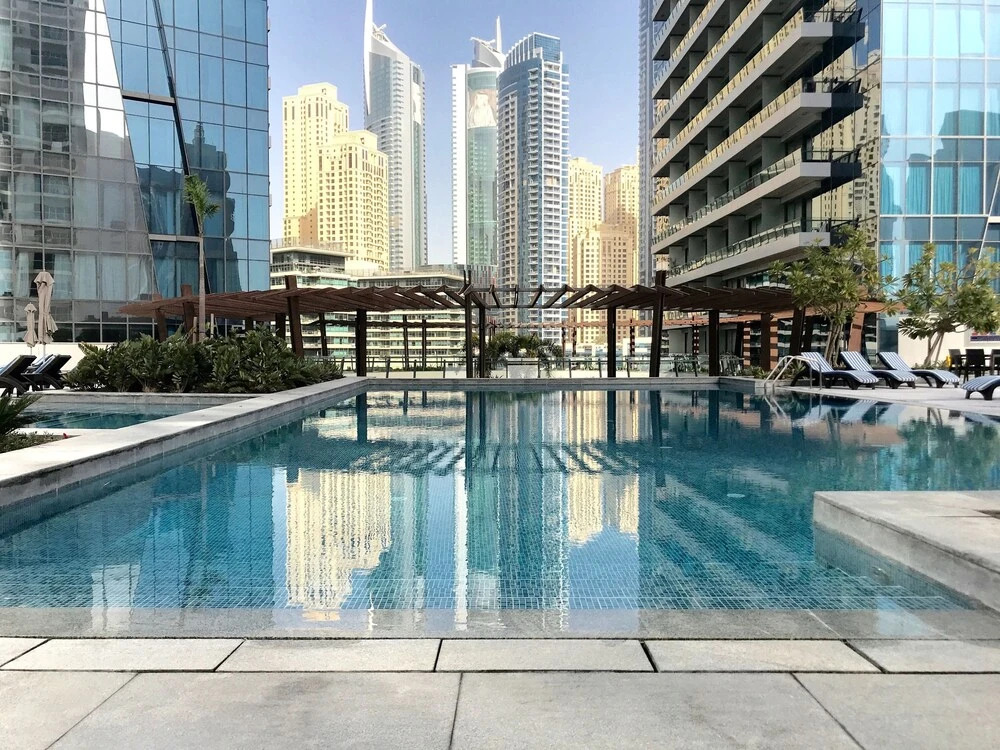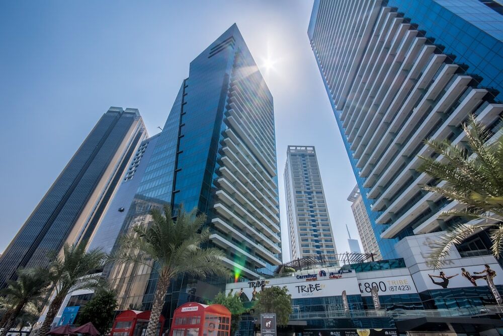 This apartment complex welcomes guests in Dubai.