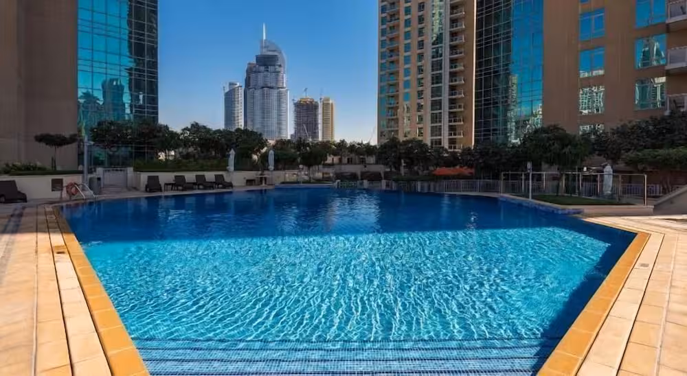 This apartment complex warmly welcomes guests in Dubai.
